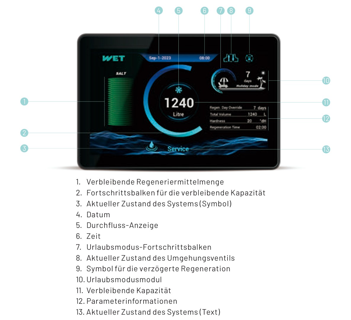 Das integrierte Touch-Display zeigt jederzeit wichtige Betriebsdaten wie aktuellen Durchfluss, verbleibende Kapazität oder den Salzstand an.