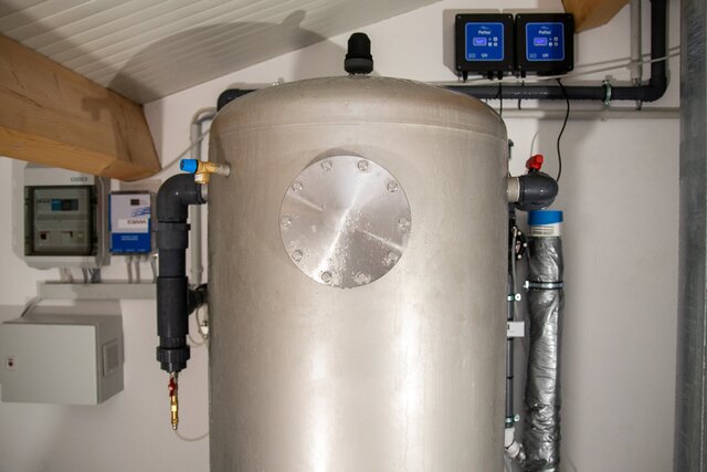 Der Reitstall in Münster nutzt drei eigene Brunnen, deren Wasser jedoch stark mit Eisen, Mangan, Kalk und Keimen belastet war. Um sowohl Tränkwasser für Sportpferde als auch Wasser für Stall, Hof und Reitplatz sicher nutzbar zu machen, wurde eine kombinierte Aufbereitungslösung installiert. Edelstahl-Filterbehälter mit Oxidationsluft entfernen Eisen und Mangan, eine Enthärtungsanlage reduziert Kalk, und eine UV-Einheit sorgt für mikrobiologische Sicherheit. Ein 1.000-Liter-Vorratstank stellt die Versorgung sicher, während eine leistungsstarke Tiefbrunnenpumpe den hohen Wasserbedarf für die Reitplatzberegnung abdeckt. Trotz des anspruchsvollen Einbauorts auf einem Zwischenboden konnte eine stabile und hygienische Gesamtversorgung umgesetzt werden.