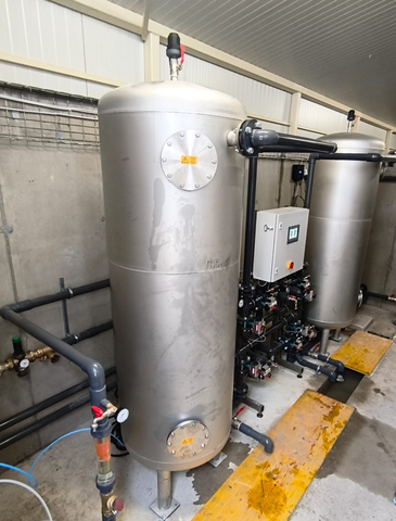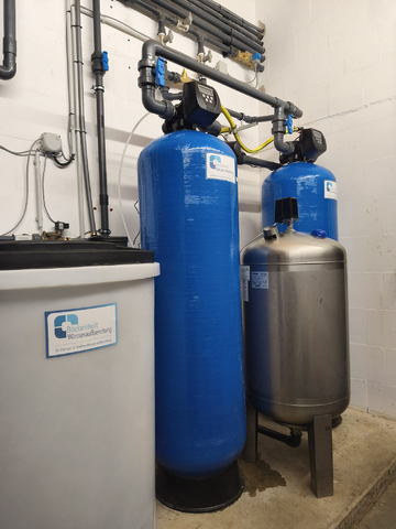 Ein gewerblicher Reinigungsbetrieb benötigte Reinstwasser für die Gebäude- und PV-Reinigung sowie dauerhaft härtefreies Wasser für Waschmaschinen. Installiert wurde eine Kombination aus Pendel-Enthärtungsanlage zur Vorbehandlung und einer Umkehrosmoseanlage zur Reinstwassererzeugung. Ein 500-Liter-Lagertank dient als Pufferspeicher. Für den Wäschereibetrieb wurde eine separate leistungsstarke Enthärtungsanlage integriert.